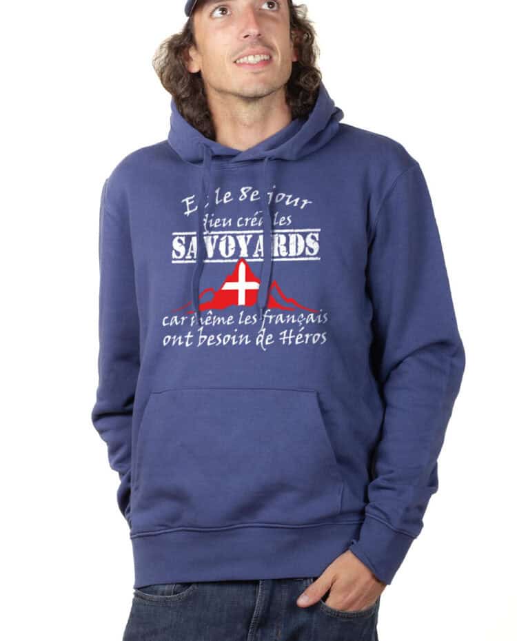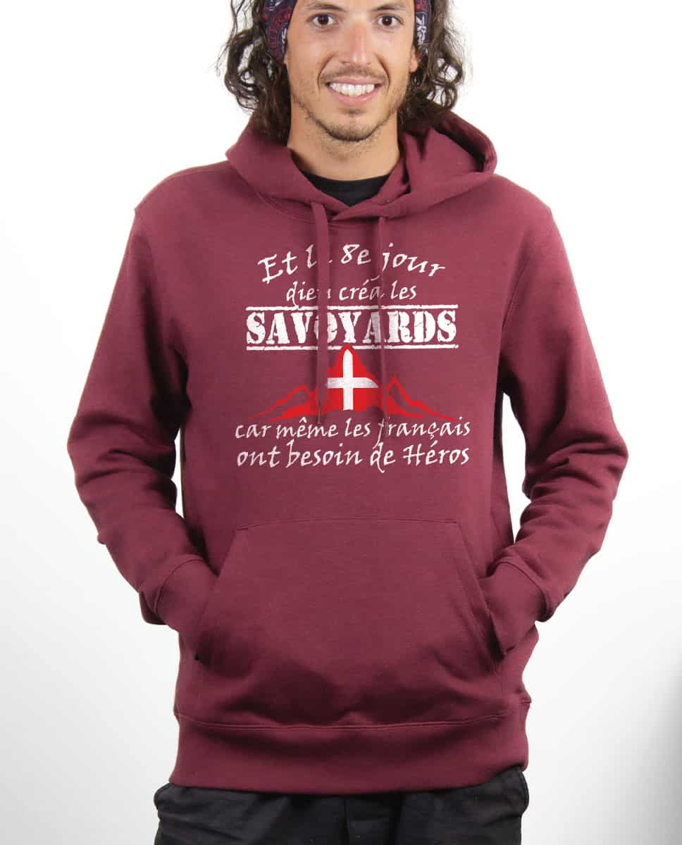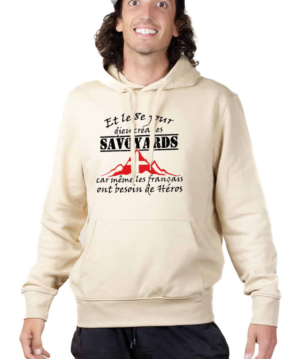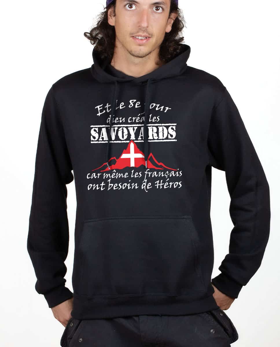 Et le 8ème jour Dieu créa les Savoyards car même les Français ont besoin de Héros. Consacrer un jour entier à la création de cette espèce spéciale était la moindre des choses pour parvenir à un tel degré de perfection, n’est-ce pas ? Un sweat pour les Savoyards fiers de l’être et qui ont de l’humour !