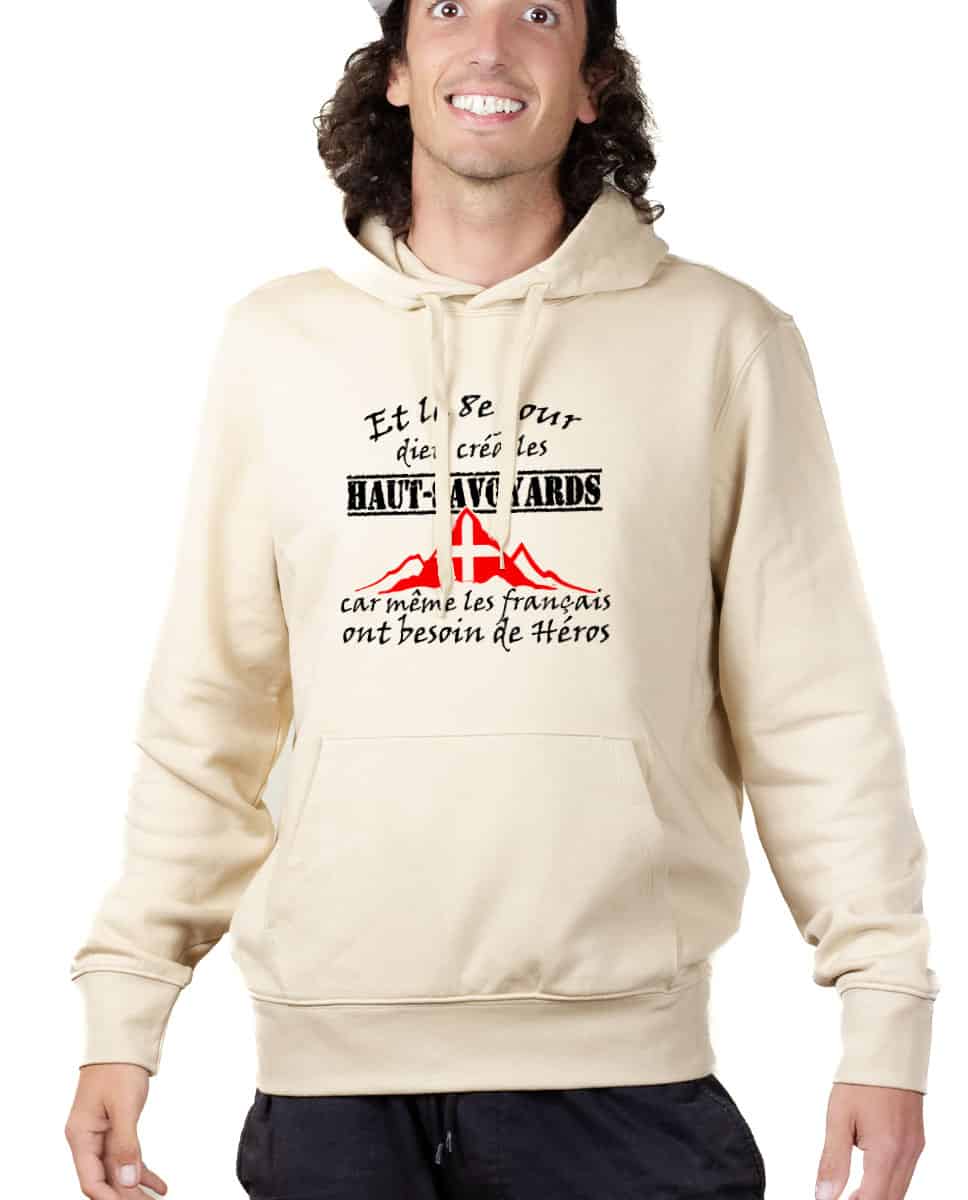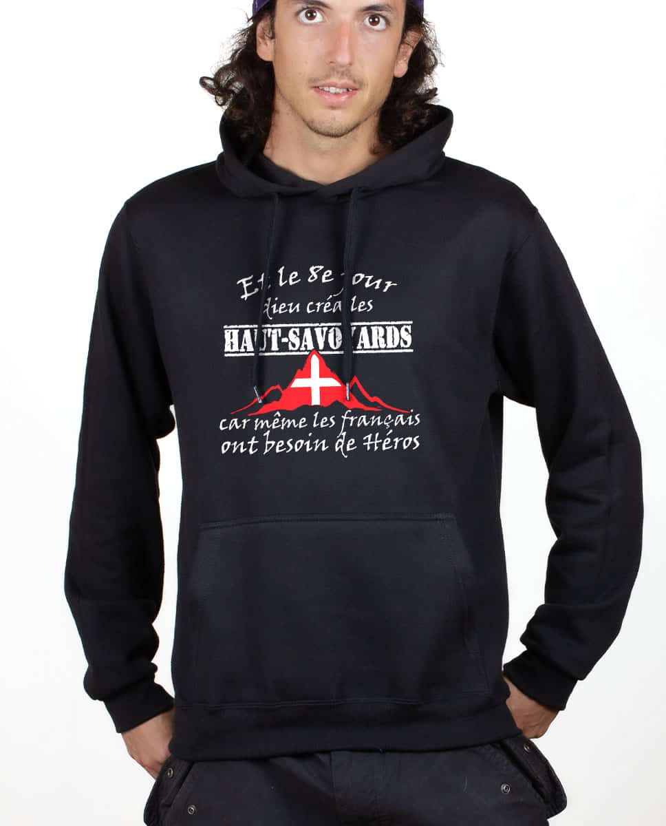 Et le 8ème jour Dieu créa les Haut Savoyards car même les Français ont besoin de Héros. Consacrer un jour entier à la création de cette espèce spéciale était la moindre des choses pour parvenir à un tel degré de perfection, n’est-ce pas ? Un sweat pour les Haut Savoyards fiers de l’être et qui ont de l’humour !